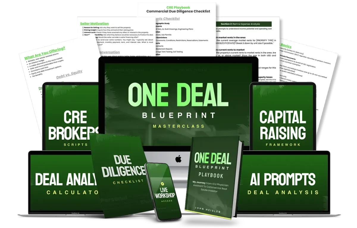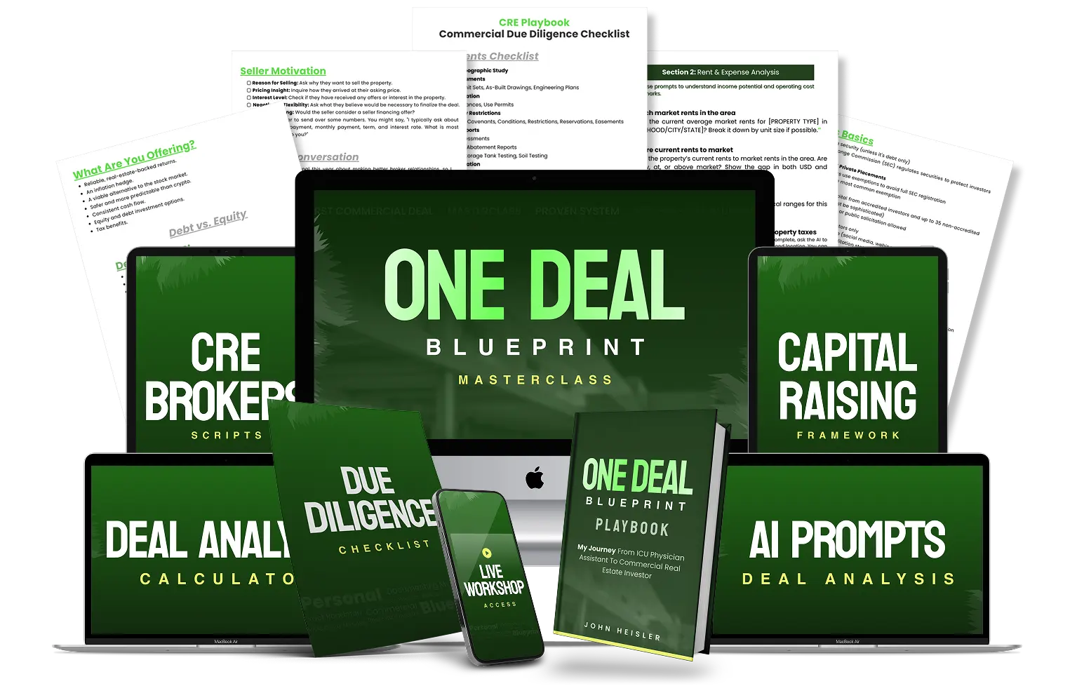 The One Deal Blueprint is a step-by-step process that frees you from the residential grind forever.